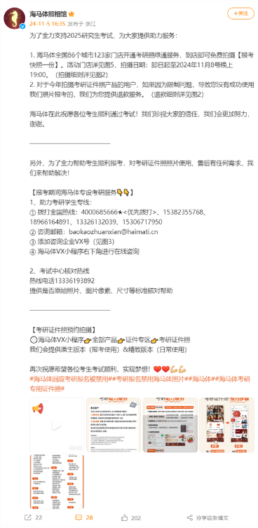 11月5日,关于“考研报名禁用海马体照片”的话题冲上了热搜榜首,引发了广泛关注。海马体照相馆创始人黄逸涵对此事件作出回应,他表示,尽管考研报名提交工作已接近尾声,但今年海马体已为超过12万考生提供了考研照片服务。黄逸涵表示,海马体将继续提升服务标准,力争成为更多人的首选,并赢得更多考点的认可。