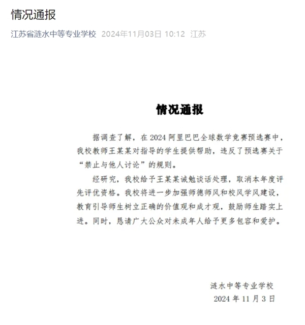 据了解,在2024年阿里巴巴全球数学竞赛预选赛中,该校教师王某某违反规则,对指导学生提供帮助。