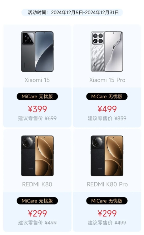 据小米服务官方消息,小米 15 和 REDMI K80 系列现推出限时 MiCare 无忧版优惠活动。促销期间,REDMI K80/Pro 仅需 299 元,小米 15 仅需 399 元,小米 15 Pro 也只需 499 元,享受 6 折优惠。