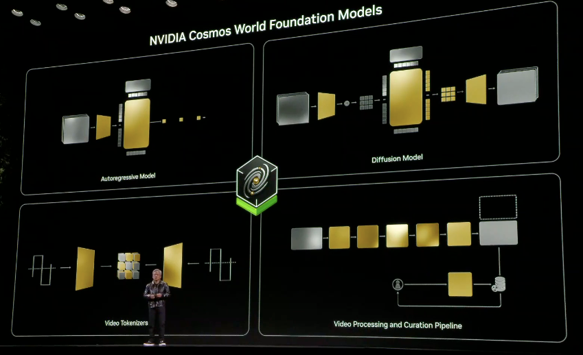 一同发布的还有Cosmos 平台。黄仁勋介绍,Cosmos平台拥有一系列开放的预训练世界基础模型,专为生成具有物理感知的视频和物理AI开发所需的世界状态而设计。