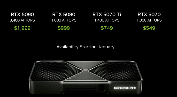 新发布的RTX 50 系列 GPU有四个产品系列,分别是RTX5090、RTX5080、RTX5070Ti和RTX5070;售价方面,RTX 5090售价1999 美元、RTX 5080售价999 美元、RTX 5070Ti售价749 美元、RTX 5070售价549 美元。