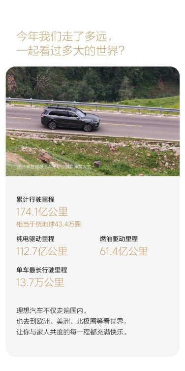 所有理想汽车累计行驶里程达到174.1亿公里,相当于绕地球43.4万圈。其中,纯电驱动里程为112.7亿公里,燃油驱动里程为61.4亿公里。