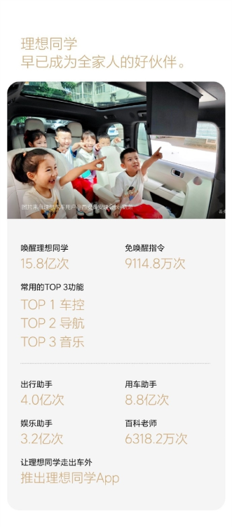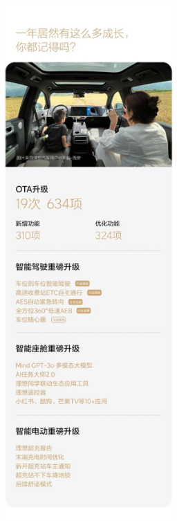 2024年,理想汽车进行了19次OTA升级,更新了634项功能。理想同学被唤醒15.8亿次,副驾屏和后舱娱乐屏的使用时长达到7513.7万小时。理想超充站累计上线1727座。