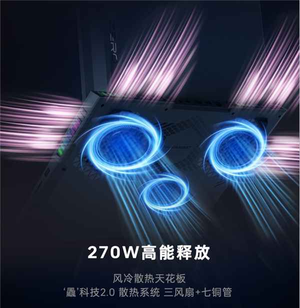 为了应对强劲的性能,雷神 ZERO 18 采用了升级版“飍”科技 2.0 散热系统,三风扇散热搭配 7 铜管,实现了高达 270W 的性能释放。