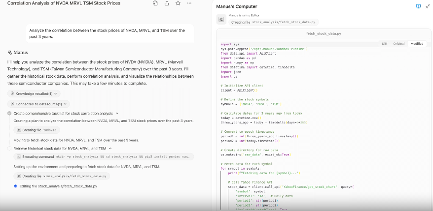 Manus通过 API 访问权威数据源。在验证数据后,它开始编写代码,进行数据分析和可视化图表绘制,向用户反馈其中的因果关系。
