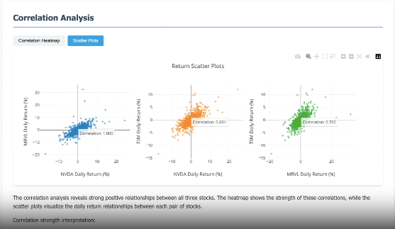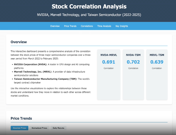 用户提出需求:分析过去三年英伟达、迈威尔科技和台积电股票价格之间的相关性。