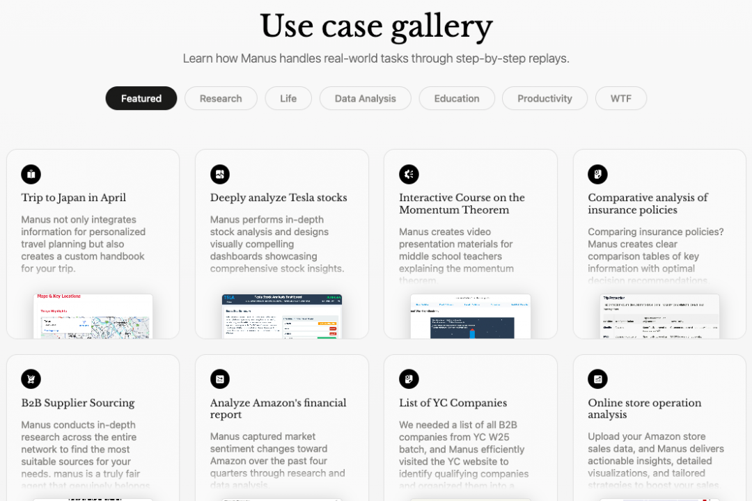 除了视频演示的能力外,在Manus官网还展示了更多能力,包括且不限于: