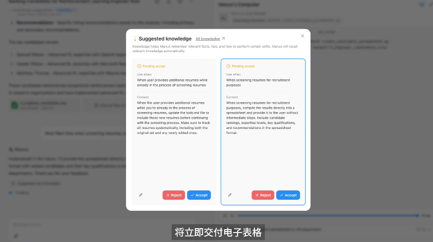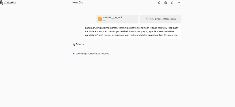 用户向Manus提交了10份简历的压缩文件,Manus会自动解压文件,然后浏览每份简历并记录重要信息。期间,用户又再次上传5份简历给Manus。在分析完所有15份简历后,Manus 给出了排名建议,并提供了候选人资料和评估标准作为参考。最后,用户让 Manus 生成Excel表格,Manus能自动将这些内容通过编写代码来生成对应的表格。