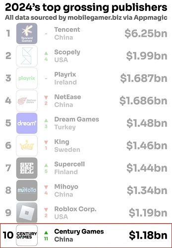 图3 世纪华通旗下点点互动稳居 2024 年全球手游发行商收入TOP10