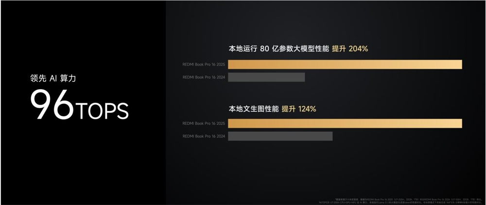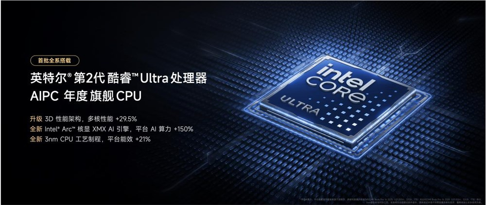 REDMI Book Pro 2025系列最高搭载英特尔®第2代 酷睿™ Ultra 7 255H处理器,基于3nm制程工艺打造,内置6 个性能核、8 个能效核以及 2 个低功耗能效核,共计 16 个核心,内置24MB高速缓存,性能核最大睿频可达5.1GHz,对比上代多核性能提升29.5%。集成全新intel Arc 核显,内置XMX AI引擎, AI算力达到惊人的96TOPS,可支持80亿参数本地大模型稳定运行。配备顶级规格的32GB LPDDR5X 8400MT/s超高频内存,对比上代LPDDR5X 7467MT/s内存,写入速度提升16.9%、拷贝速度提升13.8%。