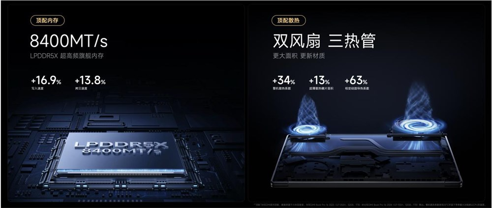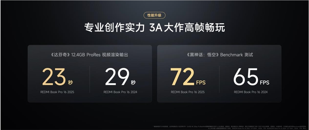 REDMI Book Pro 16 2025采用飓风散热系统,配备12V电竞级双百叶静音风扇、8mm+6mm+6mm三热管、顶级相变导热硅脂导PTM-7958、超大散热板覆盖处理器以及供电 IC,整机散热系数相比上代提升34.4%,狂暴模式下实现80W超强性能释放。《达芬奇》12.4GB ProRes视频渲染输出仅需23秒,《黑神话:悟空》Benchmark测试可达 72 帧。更有1TB PCIe 4.0 SSD、WiFi6高速无线网卡等顶尖硬件配置加持,无论是日常重度办公还是主流 3A 游戏大作,都能轻松驾驭。