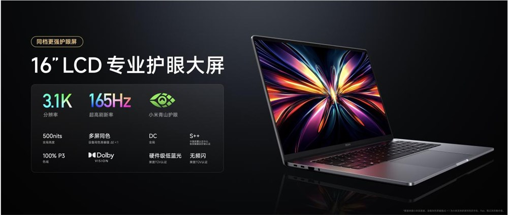 REDMI Book Pro 16 2025配备16英寸3.1K 165Hz 500nits专业护眼大屏,16:10屏幕比例,分辨率3072*1920, PPI可达226,屏幕显示清晰细腻。支持500nits亮度,100%-P3色域,全局DC调光,更有小米手机、平板、笔记本跨设备多屏同色,同一张图片、视频,多端显示色彩显示准确、亮丽、无色差。同时,设备获得杜比视界+HDR 400认证,小米手机、Pad创作的杜比/HDR内容可无差别在笔记本端显示和创作,实现创作的全链路无缝闭环。作为首款搭载小米青山护眼的笔记本,REDMI Book Pro 16 2025获得中国质量认证中心视觉健康友好度S++认证,并通过了德国莱茵TÜV硬件低蓝光和无频闪认证,大屏清晰更护眼。