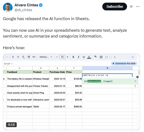 Google表格的最新更新引入了=AI()函数,允许用户通过简单的提示(prompt)直接在表格中调用AI能力。社交媒体反馈显示,这一功能特别适合处理结构化数据任务,例如生成文本、分类信息、总结内容或进行情感分析。用户只需在单元格中输入类似=AI("生成10字以内活动口号", A2)的指令,即可获得定制化的输出。