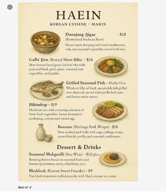 I'm opening a traditional concept restaurant in Marin called Haein. It focuses on Korean food cooked with organic, farm-fresh ingredients, with a rotating menu based on what's seasonal. I want you to design an image - a menu incorporating the following menu items - lean into the traditional/rustic style while keeping it feeling upscale and sleek. Please also include illustrations of each dish in an elegant, peter rabbit style. Make sure all the text is rendered correctly, with a white background.
