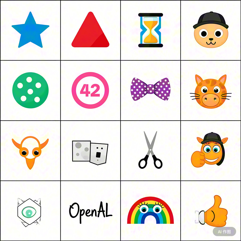 (一个正方形图像,包含一个4行乘4列的网格,在白色背景上包含16个对象。从左到右,从上到下。以下是列表: