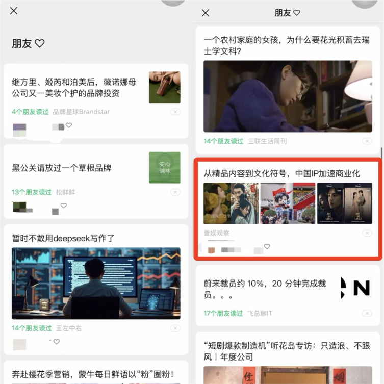 据新榜编辑部观察,同一时间两者展示的文章内容虽不完全相似,但内容推荐逻辑存在着高度重合,都是参考朋友推荐和读过两个维度,连对外展示都使用一样的“朋友♡”标识。