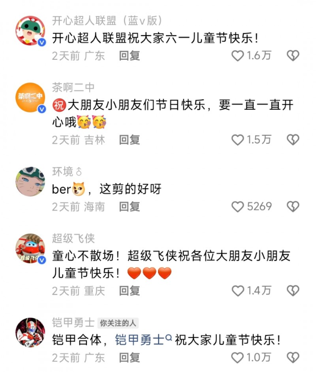 短片一经发布,便迅速引发了广大网友的共鸣,那些熟悉的角色、经典的场景,瞬间将大家拉回到了童年时代。在央视新闻的评论区,各大 IP 也纷纷留言送上儿童节祝福。@超级飞侠表示“童心不散场,超级飞侠祝各位大朋友小朋友儿童节快乐”;@铠甲勇士帅气回应 “铠甲合体,铠甲勇士祝大家儿童节快乐”;@茶啊二中则亲切评论“要一直一直开心哦”;@巴啦啦小魔仙也送上祝福 “即使长大了,你也有专属的巴拉巴拉能量。”这些留言不仅让网友们感受到了IP们的温暖,也进一步激发了大家对童年的美好回忆。