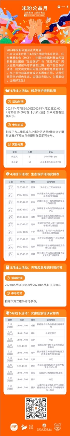 在小米公益基金会成立五周年之际,小米公益平台将于 4 月 7 日至 5 月 31 日期间举办 2024 年“米粉公益月”。此次小米公益平台首次采用“公益主题月”的形式,以“生态保护”与“应急响应”为两大核心主题,携手专业环保机构及救援组织,历时两个月,通过丰富多彩的线上线下活动,倡导更多米粉关注生态环境保护,提高防灾减灾意识,守护绿色生态,加强应灾能力。
