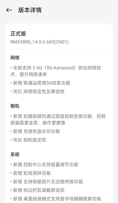 在移动网络方面,此次更新全新支持了 5.5G(5G-Advanced)技术,提升了网络速率。同时,新增联通运营商的 5G 信息功能和优化了网络稳定性及兼容性。