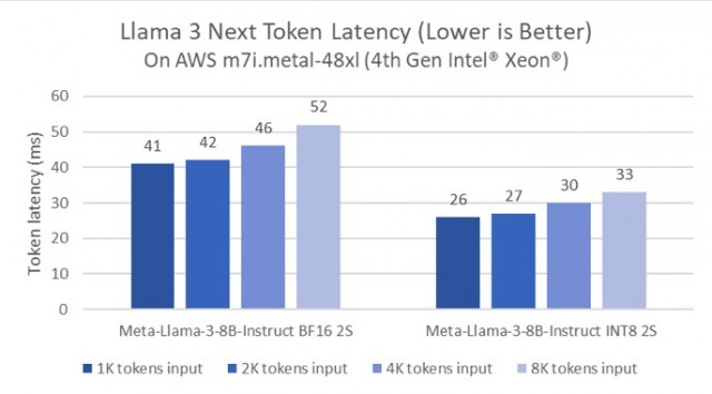 事实上,英特尔一直在持续优化至强平台的大模型推理性能。例如,相较于Llama 2模型的软件,PyTorch及英特尔PyTorch扩展包(IntelExtension for PyTorch)的延迟降低了5倍。这一优化是通过Paged Attention算法和张量并行实现的,这是因为其能够最大化可用算力及内存带宽。下图展示了80亿参数的Meta Lama 3模型在AWS m7i.metal-48x实例上的推理性能,该实例基于第四代英特尔至强可扩展处理器。