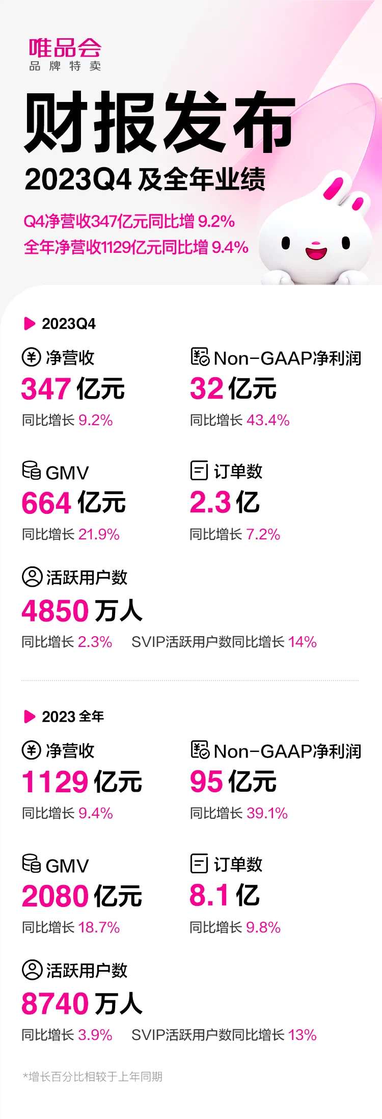 财报显示,唯品会第四季度实现净营收347亿元,同比增长9.2%;净利润29.8亿元,上年同期为22.4亿元,同比增长33%;2023年第四季度GMV达664亿元,同比大增21.9%。