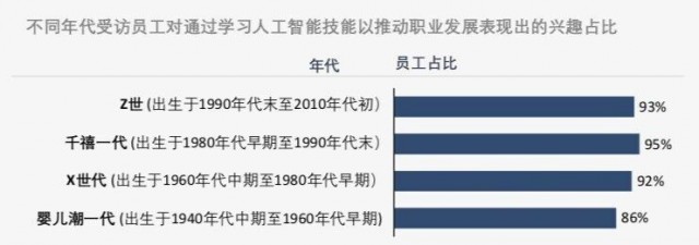 数据显示,不仅是新一代崛起力量的Z世代(93%),还有当今社会主力军的千禧一代(95%)和即将迎来退休高峰的婴儿潮一代(86%)的员工,都希望通过学习人工智能技能来推动个人职业发展。同时,无论是男性(94%)还是女性(95%)员工,都对学习人工智能技能表现出浓厚的兴趣。