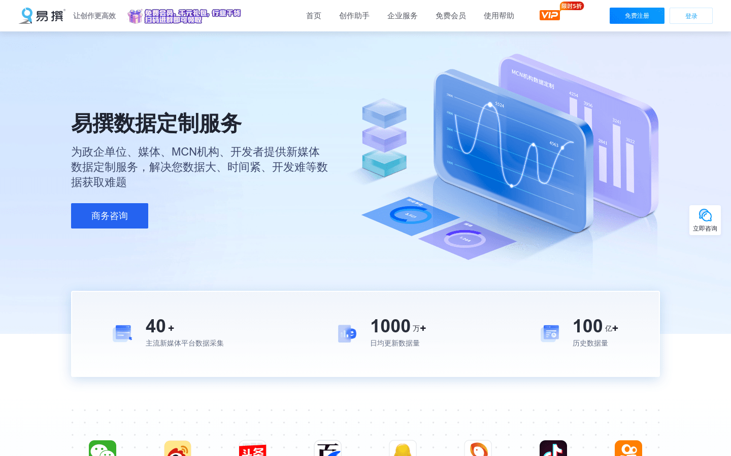 易撰是一个专注于新媒体数据挖掘和分析服务的平台,它为新媒体内容创作者提供数据定制服务,帮助政企单位、媒体、MCN机构和开发者解决数据获取难题。易撰提供日均更新数据量达 1000 的海量历史数据,并支持分钟级账号/内容监测。