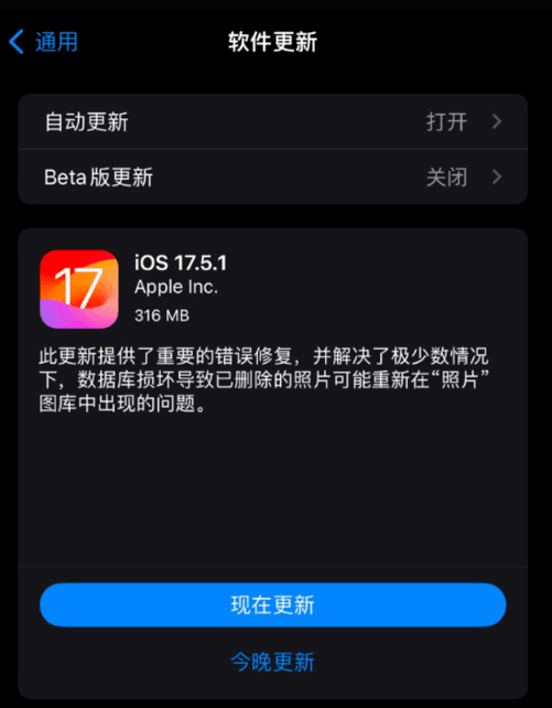 近日,苹果为iPhone用户推出了iOS 17.5.1版本的更新。此次更新的主要修复内容包括:解决了数据库损坏导致已删除的照片可能重新出现在“照片”图库中的问题,并对系统进行了优化和改进。