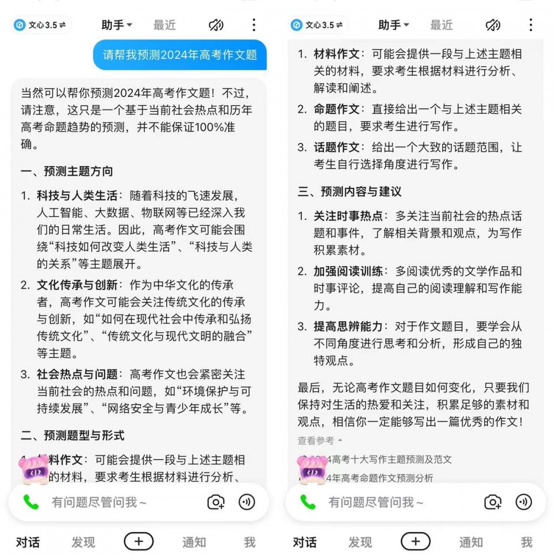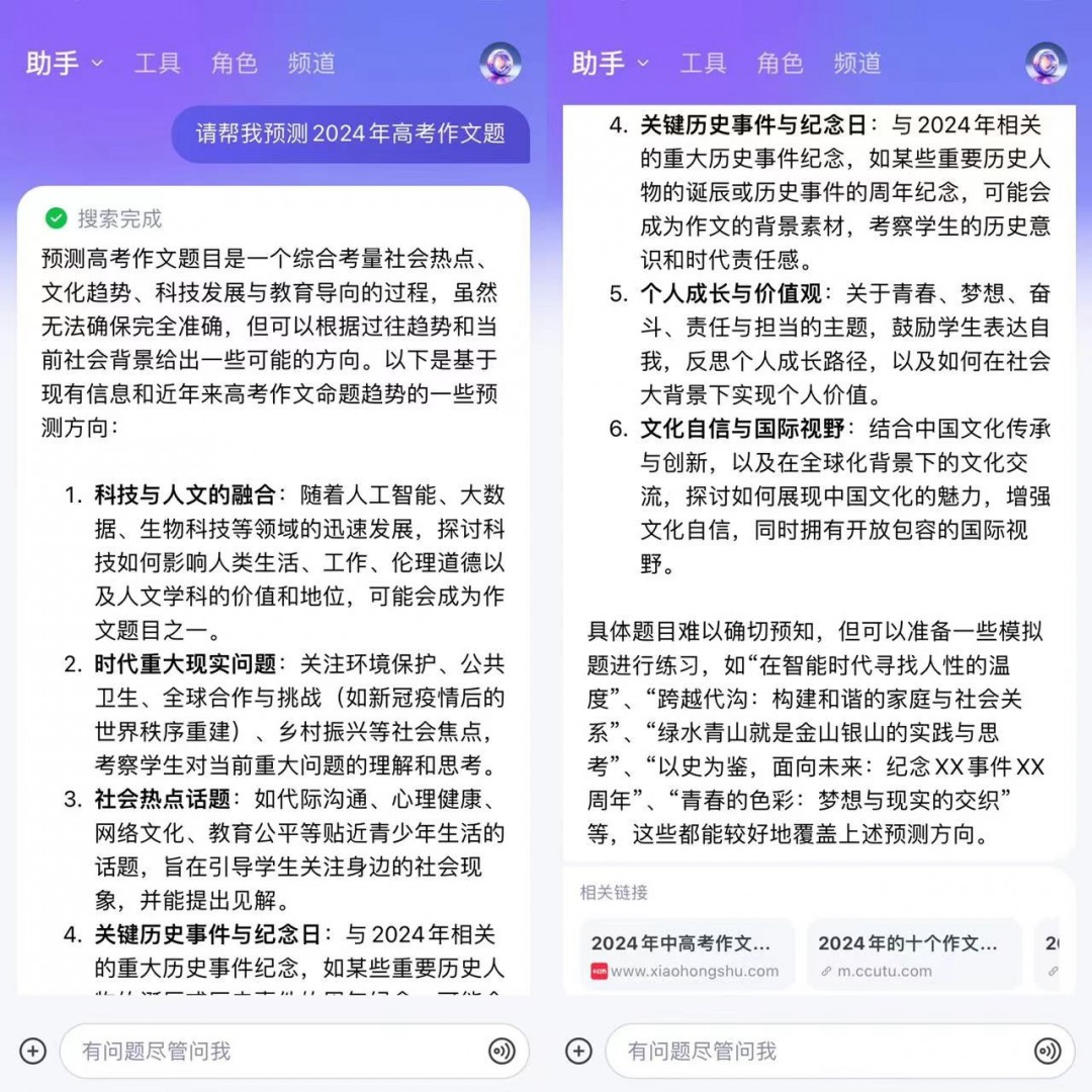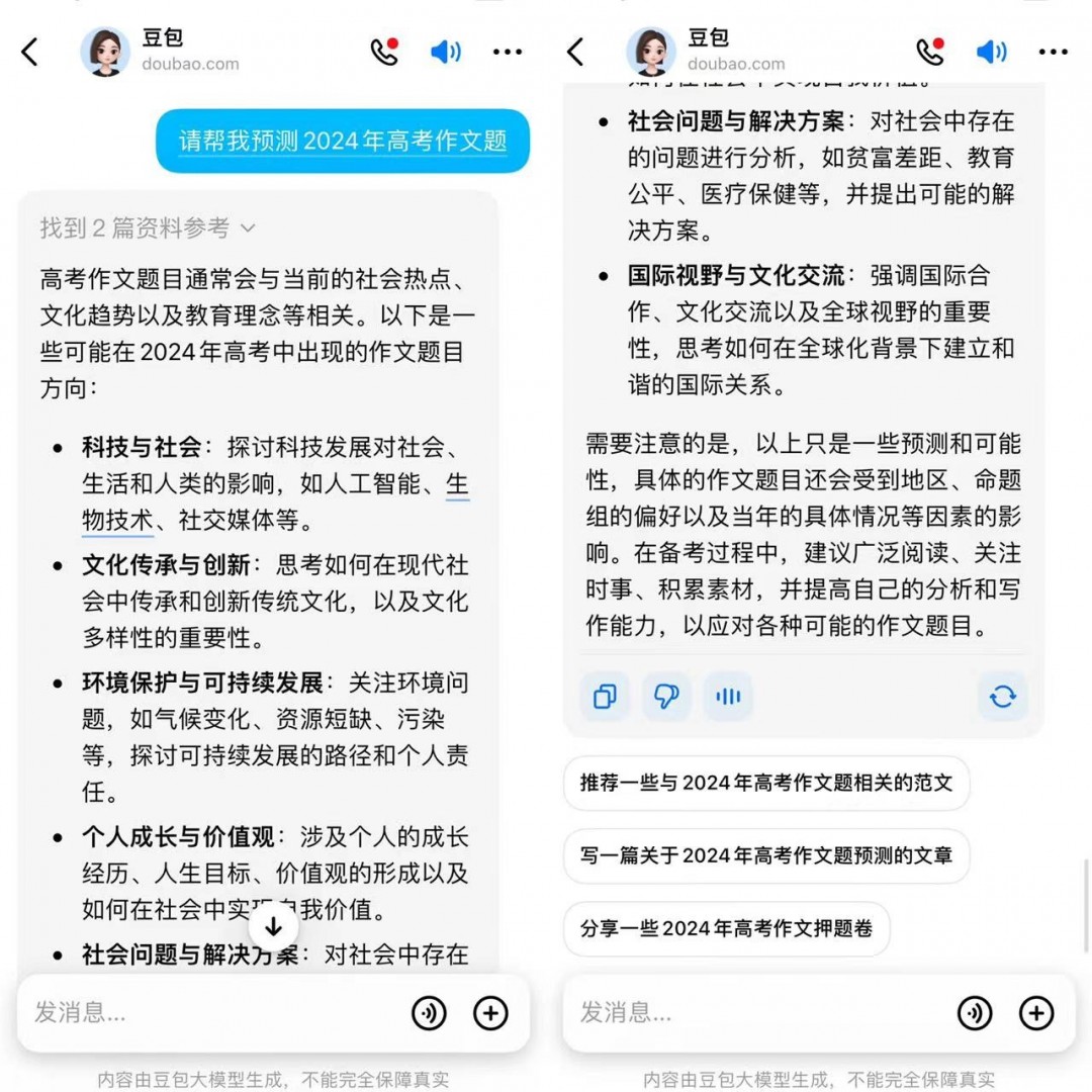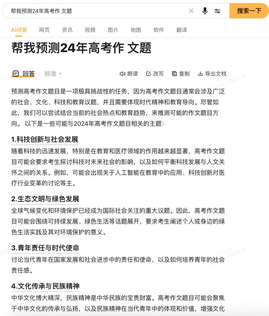 纵观这些年的高考作文题目,大多也都是围绕当下的热点,和公众对这个时代的价值诉求展开,AI大模型押的题可能真的会出现在高考作文上。去年高考,360智脑大模型预测了10个作文方向,其中两道题目分别押中全国甲卷和新课标II卷。