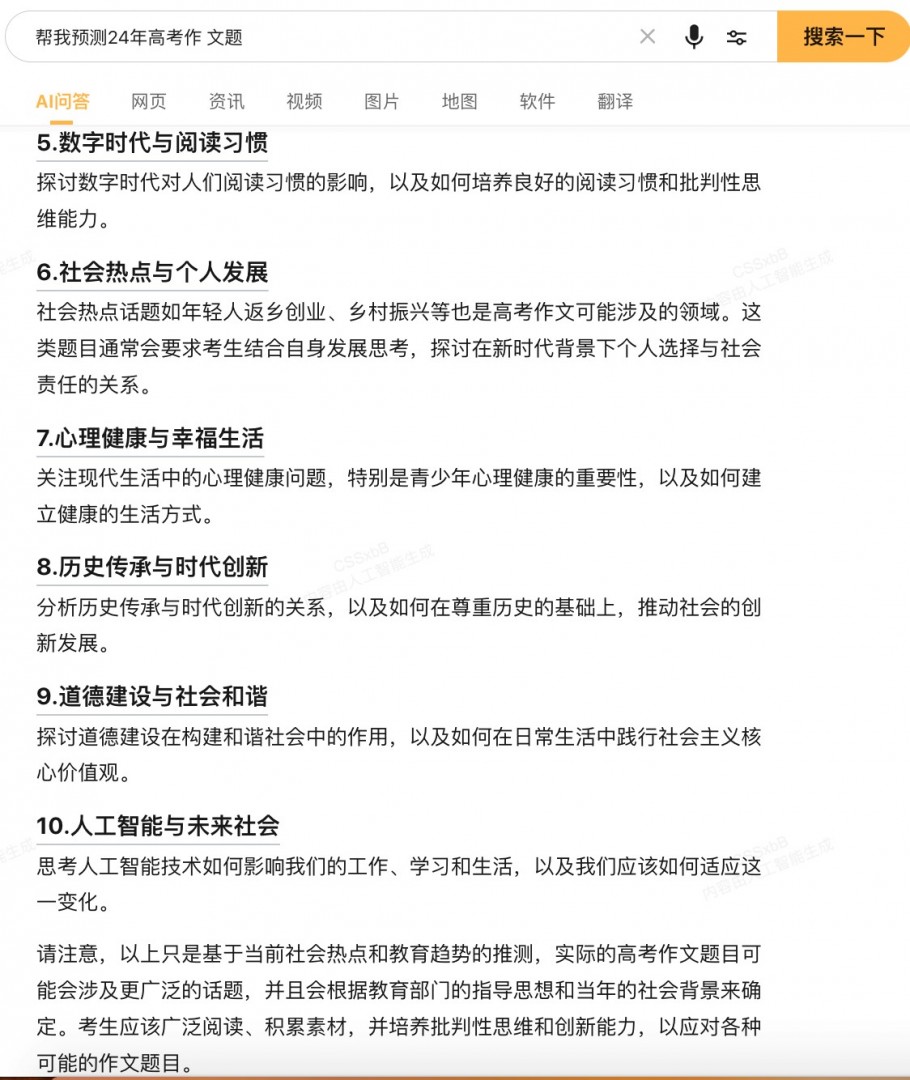 360AI搜索结合当前的社会热点和教育趋势,预测了10个高考作文题目相关主题,包括科技创新与社会发展、生态文明与绿色发展、青年责任与时代使命、文化传承与民族精神、数字时代与阅读习惯、社会热点与个人发展、心理健康与幸福生活、历史传承与时代创新、道德建设与社会和谐、人工智能与未来社会。