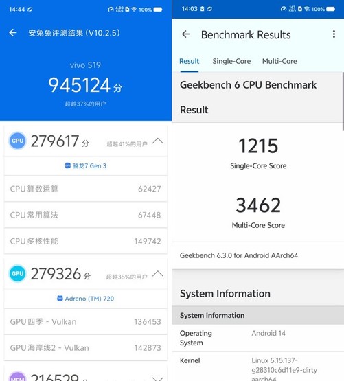 接下来我们进入实测环节,测试软件为安兔兔V10,最终其得分为945124;GeekBench V6单核成绩1215,多核成绩3462,日常流畅使用足够用。