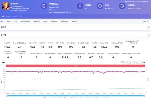 光看跑分成绩显然不能展现出这款手机的实际实力,咱们游戏实测见真章。笔者这次选择了“全民MOBA手游”《王者荣耀》进行测试,游戏设置中开启超高帧率 高分辨率,并采用PerfDog记录下游戏全程的帧率表现情况,结果如下: