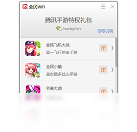 全民WiFi为腾讯第一款全民级硬件产品,插入电脑后,安装此客户端,即可产生WiFi让手机0流量高速上网。支持二维码扫一扫接入WiFi,所有腾讯网游加速,并可领取腾讯热门手游(全民飞机大战、节奏大师等)超值大礼包。安装客户端后启动客户端即可根据引导购买硬件产品。
