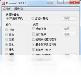一个免费小巧功能强大的关机管理工具软件。您可以设定不同时间,让它自动实现注销、重新启动、关机、切断电源、待机、休眠、锁定、远程唤醒等多项功能。支持远程控制计算机。支持关机前提示信息、关机前运行程序、强制结束进程、声音提示等功能。