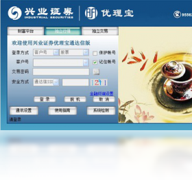 兴业证券优理宝通达信是基于Windows平台运行的新一代网上行情交易软件。通达信软件广泛用于中国证券行业,拥有众多客户,包括证券公司、基金公司、商业银行以及广大的股民朋友,在证券行业有极高的声誉。该软件融合且优化了目前国内证券主流分析软件的主要功能,集行情分析、技术分析、财务分析、资讯信息、互动交流、个人理财于一体,功能强大,操作简便,具有全方位扩展性,是您理想的行情分析软件。