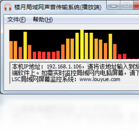 楼月局域网声音传输系统能够将本机电脑上的声音实时传输到局域网内另外一台电脑上进行实时播放,音质特别清晰。 适用范围:1. 有些工业系统上的电脑,安装有一些设备的报警系统软件,使用本软件后,可将报警声音实时传输到控制总机上进行实时播放。 2. 也可使用本软件将本机电脑上的音乐实时传输到局域网内其它电脑上进行同步播放。