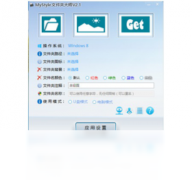 是否厌烦了电脑千篇一律的文件夹,MyStyle文件夹大师帮您方便的个性化您的文件夹,打上自己特有的标签。除了更改文件夹的图标外,软件还支持文件背景图片,文件夹内文件名颜色设置,文件夹注释,文件夹显示名设置,文件夹内文件显示名设置。图标设置支持exe和dll图标库文件。MyStyle文件夹大师有两种模式可供选择,方便个性化U盘里的文件夹。软件还有Win Vista、Win7、Win8的摄像头图标一键找回功能,可供选择安装。需要安装.NetFramework3.5。