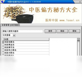 中医偏方秘方的查询工具。软件收集了众多的秘方,还有民间的土方、偏方、单方等,共8000余条,诚为家庭和医务工作者实用的参考工具。