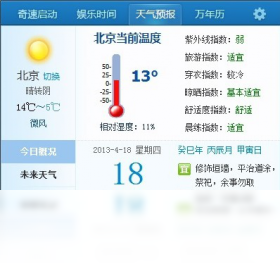 奇速日历,拥有农历(宜忌)、节日、节气、天气预报、定时关机、闹铃提醒等独特功能。不占用电脑屏幕任意位置,定制独特的任务栏时间区显示,拥有农历(宜忌)、节日、节气、天气预报、定时关机、闹铃提醒等独特功能。