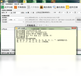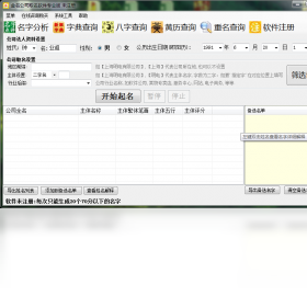 金名公司取名软件是一款功能强大的公司或店铺专业起名软件。 本软件的主要特点: 自动根据法人基本信息快速生成数万以上好名字。 自动根据五行匹配自动弥补搭配起名。 起名原理严格按照五格数理进行。 软件可以根五行,评分进行筛选名字。 软件有详细公司名称解释分析评分功能。 软件可以生成带二字名,三字名及四字名的公司名称,可以指定用什么字来生成名字。 使用本软件可快速为您的公司或店铺起个吉祥如意、生意兴隆的好名字.