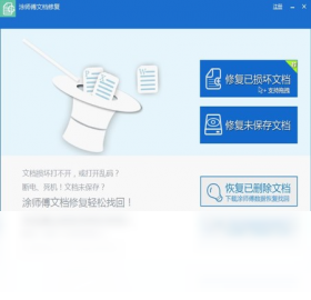 文档损坏打不开怎么办?word打不开怎么办?excel打不开怎么办?ppt打不开?乱码怎么办?断电、死机!文档未保存怎么办?涂师傅文档修复软件可帮助用户最大程度的修复损坏或丢失的文档,且不会对原文档造成二次损坏。 1.修复已损坏文档:支持对各种格式的文档修复,在文档突然打不开或打开乱码的情况下,对文档进行修复。支持的格式有:doc; dot; docm; dotm; wps; wpt; wpt; docx; dotx; xls; xlt; xlsm; xltm; et; ett; xlsx; xltx; ppt; pot; pps; potm; pptm; dps; dpt; pptx; potx; ppsx。 2.找回未保存文档:用户在工作过程中,由于忘记保存,可以通过本功能修复回来; 3.找回已删除文档:巧妙引导到数据恢复模块,当用户使用该功能时,调起涂师傅数据恢复软件,进行已删除文件的恢复。