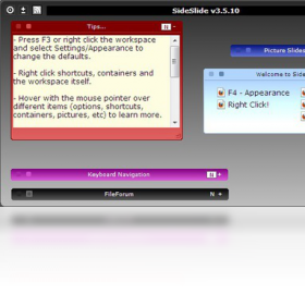 SideSlide 让你可以为程序,文档和文件夹,使用一个可以隐藏在你的计算机屏幕边缘直到使用你的鼠标将其激活才显示出来的迷你桌面来创建一个定制的运行面板。除了快捷方式之外,该软件还提供了提醒(带有提示音)和便笺以及剪贴板捕获等功能。你可以简单地拖拽快捷方式到工作区,创建用于组织你的内容的容器并且可以使用背景图像和颜色完全定制其外观。创建的容器和记录可以按层次安排,可以通过拖拽方式收缩/展开以及自由地移动。其它功能包括允许你同时开始运行多个程序的组运行功能的支持,隐藏和显示快捷方式,图像显示等。