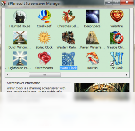 Ice Clock 3D 屏幕保护程序的3D效果非常逼真,也非常漂亮,可以用冷艳美来形容。冰冷的水面上浮着12块冰块,每块冰块代表一个整点,有序地排成一个圆形,显示着当前的时间。你可以设置为屏幕静止10分钟后启动屏保,当电脑10分钟没有任何动作后,你的屏幕就变成一个由冰块制成的时钟了。