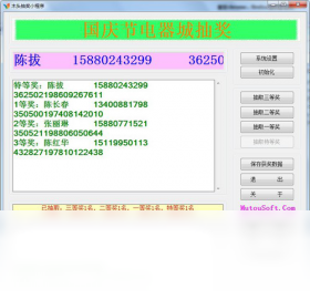 木头抽奖程序使用随机种子数,无任何规律,所以抽取的获奖名单非常公正;可根据需要设置抽奖活动名称,设置参加抽奖人员名单,随机抽取获奖人员并生成获奖名单。对电脑操作不熟练的人员也可操作,两三分钟就可学会;一般的抽奖活动都可使用,只需更改两处,即将XX单位XX怀抽奖改动本次活动名称,将参加抽将人员名单输入mutoucj。txt这个文本文件,然后运行软件摇奖、抽奖。