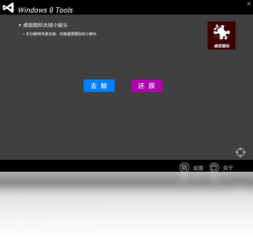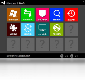 Windows8 Tools是一个windows8小工具大全,包含了N多小工具,全都可以运行在windows8系统之上。Windows 8 Tools还有hash值校验、密钥查看、定时关机、桌面图标、系统信息等功能,而且Windows 8 Tools的界面采用的是windows 8的Metro风格界面。