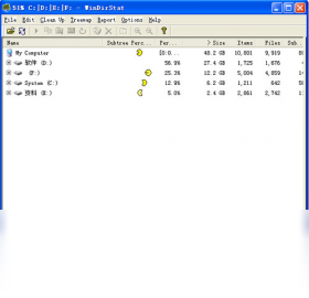 免费的硬盘容量统计软件。它能够以全彩的方式来呈现不同的文件在硬盘中占去的空间大小,让使用者可以知道是哪一类型的文件占据了您宝贵的硬盘空间。此外,点击WinDirStat所显示的颜色区块上的某颜色,软件会自动列出该颜色所代表的文件有哪些,便于快速进行处理操作。