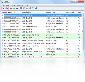 用于USB设备管理的绿色软件。可以列出当前连接到你的计算机上或者曾经连接到你的计算机上的所有USB设备,根据列出的设备的名称和描述,该软件显示了串口号(如果提供),设备添加的日期以及最后连接的日期,VendorID以及其它信息。你还可以选择断开或者卸载列表当中的任何设备,以及导出该列表为Text/HTML或者XML格式。USBDeview还可以被用于从一台远程计算机(需要访问权)通过命令行收集USB设备。