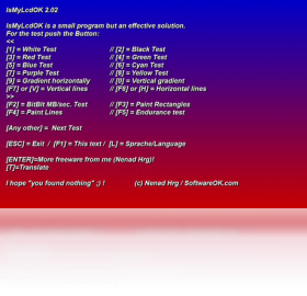 IsMyLcdOK是一个检测液晶显示器是否存在坏点的小程序。IsMyLcdOK软件体积非常小,可以不需要安装直接运行,也不需要其它运行环境。按0-9执行检测,或者按任意键依次进行检测,F1回到菜单,Esc退出。