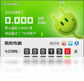 GreenPC可为您的每台电脑节省30%至60%的电费。超轻量级程序,几乎不占CPU资源,自动运行,无须人工操作。可一键关闭屏幕、一键待机、一键休眠。方便用户操作。当日用电量和省电量滚动式时时更新。可绑定腾讯、新浪,人人网帐号,晒出你的省电量。