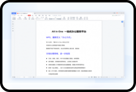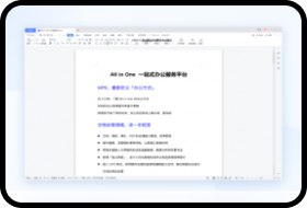 WPS,重新定义办公方式。花3分钟,了解All in One 的办公方式,对你的办公效率提升有极大帮助,因高效节省下来的时间,会让你在职场上更从容、更自由。文档处理领域,进一步拓宽:文档、表格、演示、PDF的处理能力更强、效率更高;提升脑图、流程图的使用体验,让思维工具更好用。云服务,打造专属你的资料库:1个WPS账号,联通你的资料库,登录后各种设备都能查看;文档云同步,最近打开过的文档同步到云,电脑、手机、平板随时随地处理。内容服务,更优质精品:稻壳模板,更新更全更优质的办公资源服务,下载即用,方便快捷。